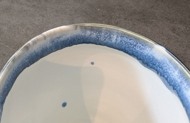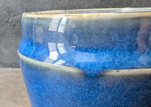 Émail bleu ascendant à l'extérieur, et blanc à l'intérieur, avec la couleur qui déborde joliment sur l'intérieur.