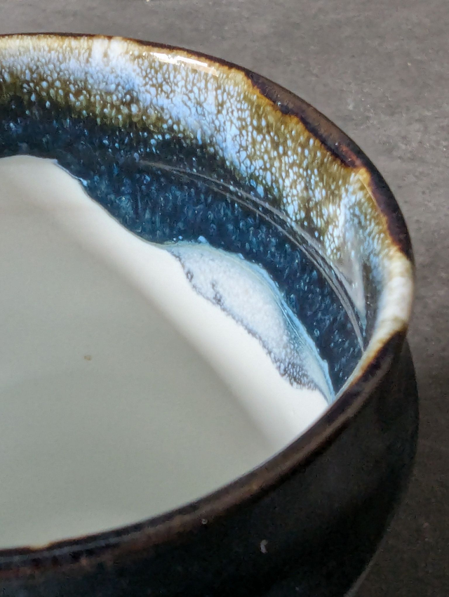Émail Nuit Stellaire (Noir avec des effets bleutés) à l'extérieur, et blanc à l'intérieur, avec la couleur qui déborde joliment sur l'intérieur.